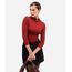 Blusa feminina confeccionada em malha de poliamida. A peça tem a modelagem e construção reta e o caimento é confortavelmente ajustado ao corpo. O modelo tem gola alta franzida com aviamento decorativo e mangas 7/8. Detalhe de acabamento pespontado na barra e punhos.