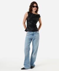 Blusa feminina confeccionada em material sintético resistente. A peça tem a modelagem acinturada, caimento solto ao corpo com franzidos laterais. O modelo tem decote redondo assimétrico e alças largas. Possui fechamento lateral por zíper e acabamento pespontado na barra.