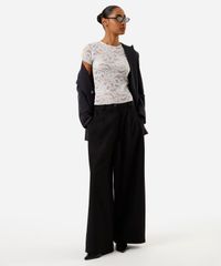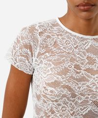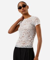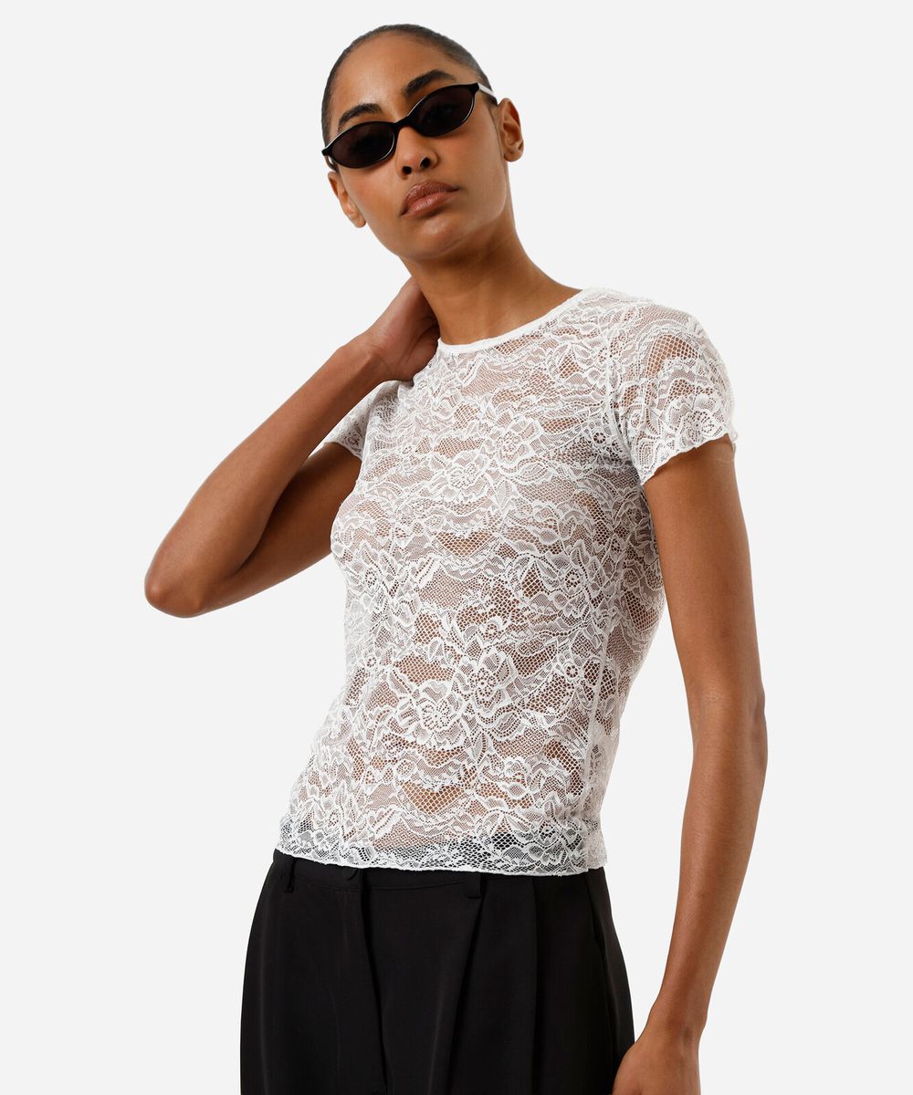 Blusa feminina confeccionada em malha de poliamida com renda delicada floral. A peça estilo segunda pele possui modelagem reta com caimento justo ao corpo, decote redondo, mangas curtas e acabamento simples.