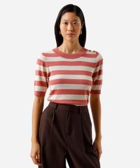 Blusa feminina confeccionada em tricot leve de viscose com padronagem listrada. A peça tem a modelagem e construção reta e o caimento é levemente ajustado ao corpo. O modelo tem decote redondo e mangas curtas. Possui botões decorativos aplicado no ombro e acabamento canelado no decote, punhos e barra.