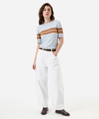 Blusa feminina confeccionada em tricot leve de viscose com padronagem listrada. A peça tem a modelagem e construção reta e o caimento é solto ao corpo. O modelo tem gola redonda e mangas curtas com punhos ajustados. Possui acabamento canelado nos punhos e na barra.