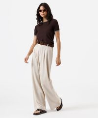 Blusa feminina confeccionada em tricot leve de viscose e poliamida. A peça tem a modelagem reta e o caimento é confortavelmente ajustado ao corpo. O modelo tem gola redonda e as mangas são curtas.