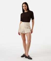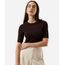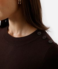 Blusa feminina confeccionada em tricot leve de viscose. A peça tem a modelagem e construção reta e o caimento é levemente ajustado ao corpo. O modelo tem decote redondo e mangas curtas. Possui botões decorativos aplicado no ombro e acabamento canelado no decote, punhos e barra.