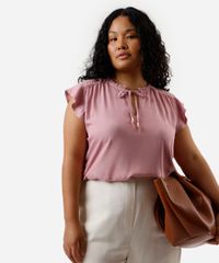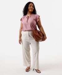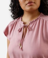 Esta blusa plus size é a escolha ideal para quem busca uma peça versátil e cheia de charme. Confeccionada em tecido plano de viscose, ela proporciona um toque suave e um caimento fluido que valoriza o conforto em todos os momentos. Seus detalhes românticos, como os babados e a amarração no decote, transformam um item essencial em uma peça especial para o seu guarda-roupa.