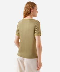 Blusa feminina confeccionada em malha de viscose. A peça tem a modelagem reta e o caimento é confortavelmente solto ao corpo. O modelo tem decote redondo e as mangas são curtas com. Detalhe de acabamento pespontado na barra e aplicação de malha contrastante nos punhos e decote.