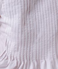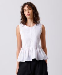 Blusa feminina confeccionada em tecido plano com algodão. A peça tem modelagem reta e caimento levemente acinturado, com pregas verticais que criam volume na barra e formam franzidos. O modelo tem decote redondo e alças largas. Detalhe de acabamento pespontado na barra.