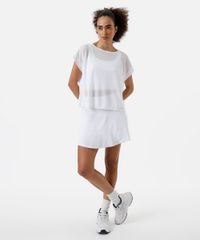 • Confeccionada em malha de poliéster com leve transparência, perfeita para sobrepor a um top esportivo.