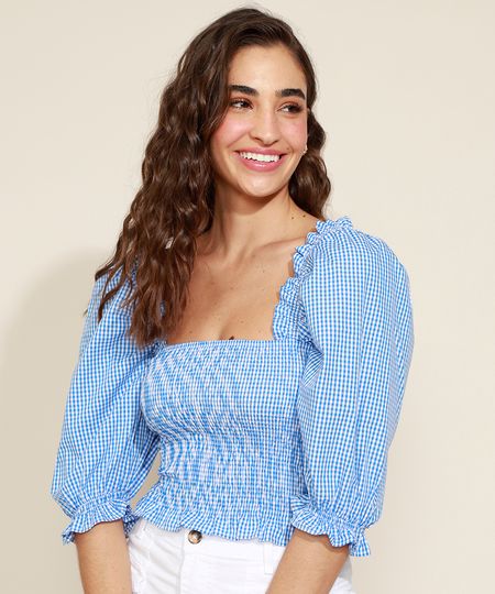 Esta blusa feminina cropped é a escolha perfeita para adicionar um toque romântico e atual aos seus looks. A charmosa estampa xadrez vichy, combinada com as mangas bufantes, cria um visual delicado e cheio de personalidade. Confeccionada em tecido plano leve, ela proporciona um caimento ajustado e confortável, ideal para diversas ocasiões.