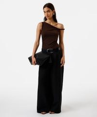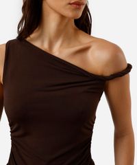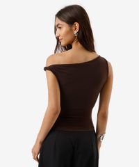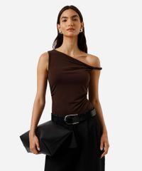 Blusa feminina confeccionada em malha. A peça tem a modelagem reta e o caimento é confortavelmente solto ao corpo, com franzidos laterais que modelam a silhueta. O modelo tem decote assimétrico e alça deslocada com efeito torcido. Possui forro em malha e acabamento pespontado na barra.
