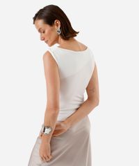 Blusa feminina confeccionada em malha. A peça tem a modelagem reta e o caimento é confortavelmente solto ao corpo, com franzidos laterais que modelam a silhueta. O modelo tem decote assimétrico e alça deslocada com efeito torcido. Possui forro em malha e acabamento pespontado na barra.
