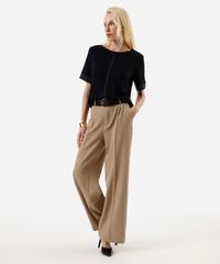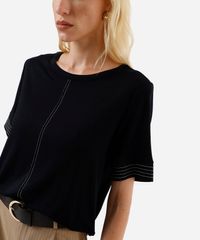 Blusa feminina confeccionada em malha de viscose. A peça tem a modelagem reta e o caimento é confortavelmente solto ao corpo. O modelo tem gola redonda, detalhe de pespontos em cor contrastante e mangas são curtas. Composição: 97% viscose 3% elastano Modelo veste: P/38 Medidas da modelo: Altura: 1,70 m Busto: 80 cm Cintura: 62cm Quadril: 80cm Instruções de lavagem: - Temperatura até 40º - Não alvejar - Não secar em secadora - Secar na vertical - Passar em temperatura média - Não lavar à seco - Limpar à úmido