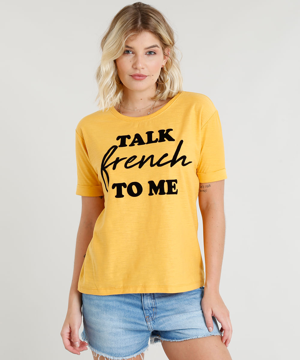 Blusa feminina confeccionada em malha flamê. A modelagem oversized é ampla com caimento solto. A parte frontal possui estampa com a frase "Talk french to me" em toque flocado. O decote é redondo com acabamento simples e as mangas são curtas com acabamento dobrado.