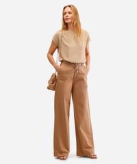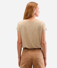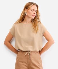 Blusa feminina confeccionada em tecido plano texturizado na parte frontal e malha na parte posterior. A peça tem modelagem reta e caimento solto ao corpo. O modelo tem decote redondo e mangas curtas. Detalhe de acabamento com canaleta na barra e tira fina para amarração e ajuste.