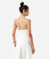 Blusa feminina confeccionada em sarja com bordado floral na parte frontal. A peça tem modelagem reta e caimento solto ao corpo. O modelo tem decote frente única e alças finas com ajuste por amarração. Detalhe de acabamento canelado na barra, punhos e decote.