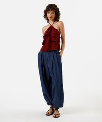 Para um look monocromático impactante, combine-a com uma calça da mesma cor e tecido. Se preferir uma produção mais casual, ela fica ótima com calças jeans de cintura alta, shorts de alfaiataria ou saias midi. Complete com sandálias de salto ou rasteirinhas para transitar entre um evento diurno e um jantar especial.