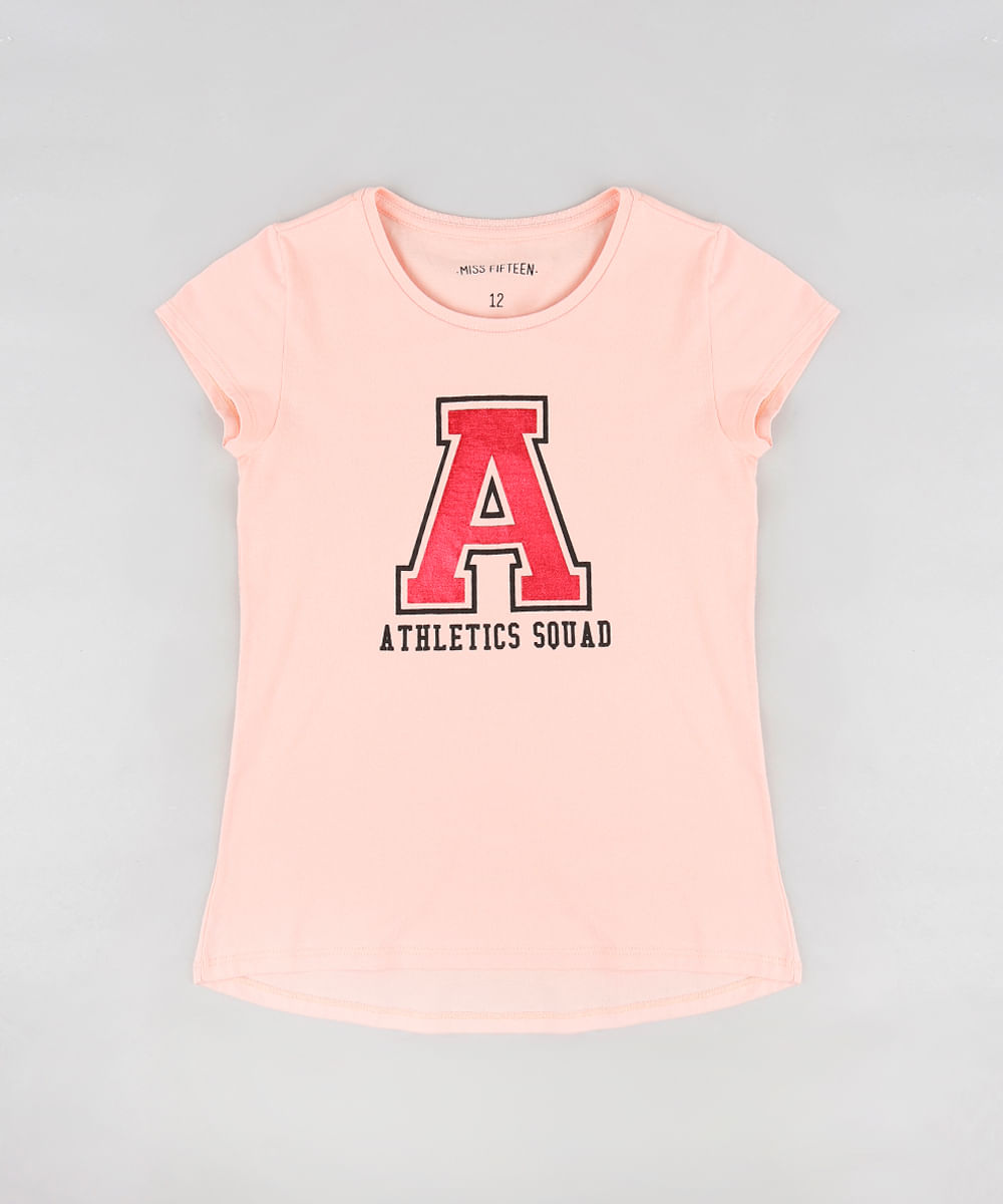 Blusa infantil feminina desenvolvida em malha. O modelo tem estampa frontal com o texto "Athletics squad" com acabamento metalizado. As mangas são curtas e o decote é redondo com acabamento em ribana.