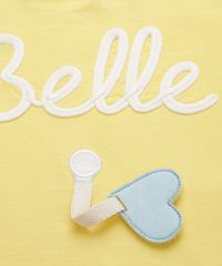 Blusa infantil feminina desenvolvida em malha macia. A parte frontal possui aplicação de cordão formando a palavra "Belle", com um coração que pode ser movimentado e tem fixação por velcro. As mangas são curtas e o decote é redondo com acabamento canelado.