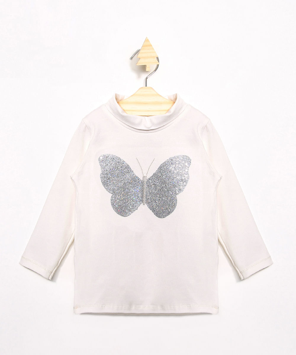 Blusa infantil feminina confeccionada em malha. O modelo tem manga longa e gola alta. Possui bordado frontal com paetês em formato de borboleta.