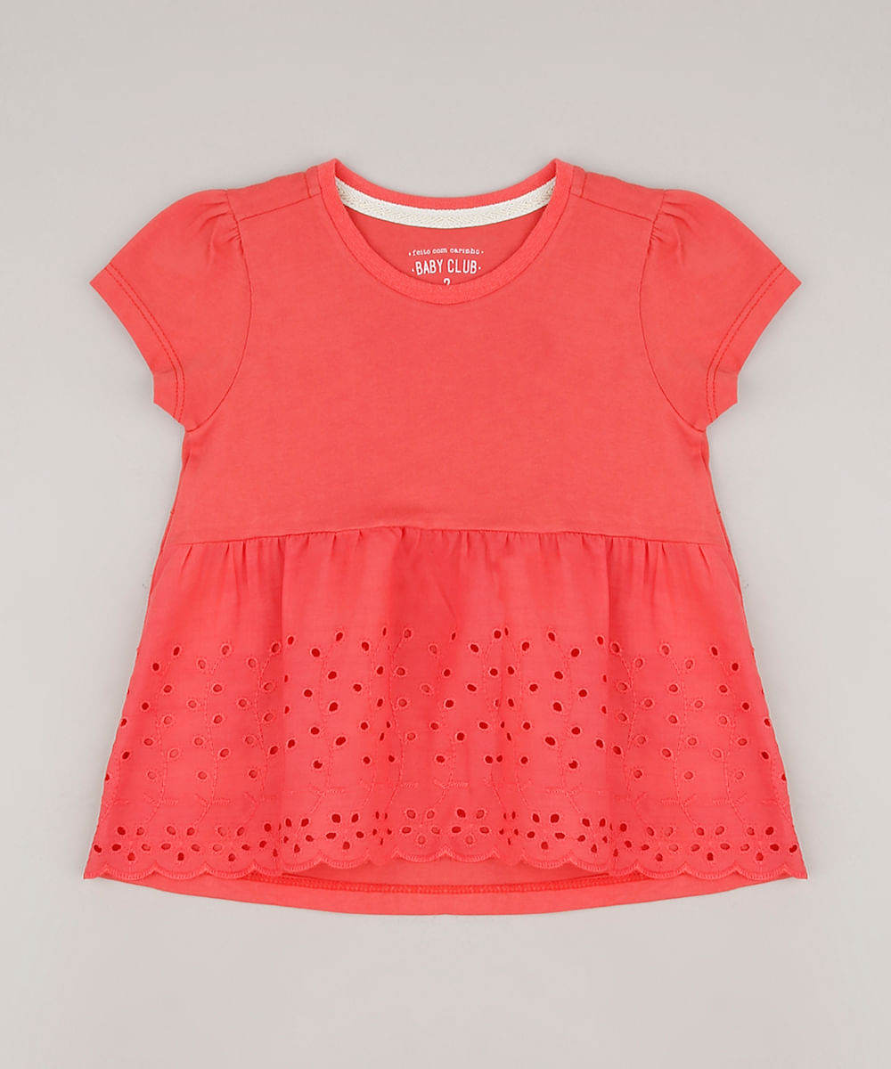 Blusa infantil feminina desenvolvida em malha. Possui recorte frontal em laise, um tecido plano bordado com micro furos. As mangas são curtas e o decote é redondo.