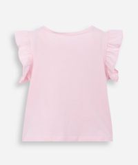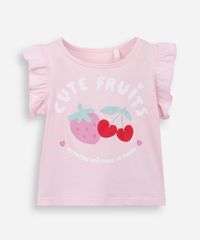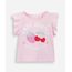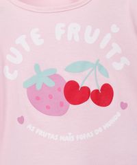 Blusa infantil confeccionada em malha macia de algodão com estampa localizada de cerejas e morango na parte frontal. A peça tem a modelagem reta e o caimento é confortavelmente solto ao corpo. O modelo tem gola redonda e as mangas são curtas formando babados. Detalhe de acabamento pespontado na barra.