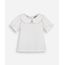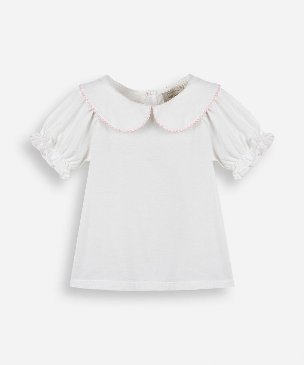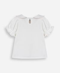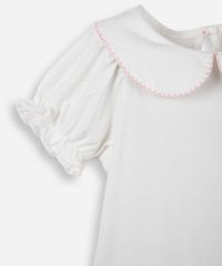 Blusa infantil confeccionada em malha macia de algodão. A peça possui gola boneca com bordado em cor contrastante, mangas curtas com elástico nos punhos com efeito de babado, caimento reto e solto e fechamento posterior por botão.