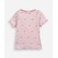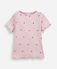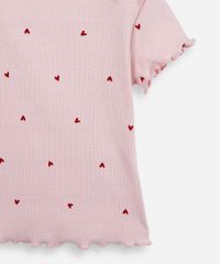 Blusa infantil confeccionada em malha canelada de algodão com estampa de corações. A peça tem a modelagem e construção reta e o caimento é confortavelmente ajustado ao corpo. O modelo tem decote redondo e mangas curtas. Detalhe de acabamento com frufru nos punhos e barra.