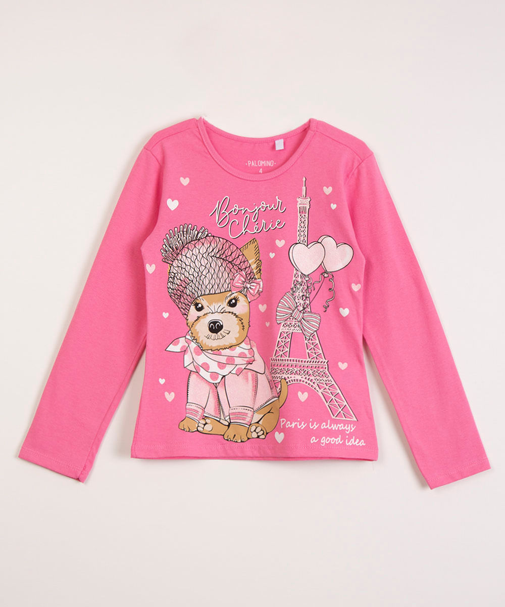 Blusa confeccionada em malha de algodão. A peça possui gola arredondada, mangas longas, caimento reto, estampa frontal de cachorrinho em cores contrastantes com efeito glitter brilhantes. Acabamento simples.