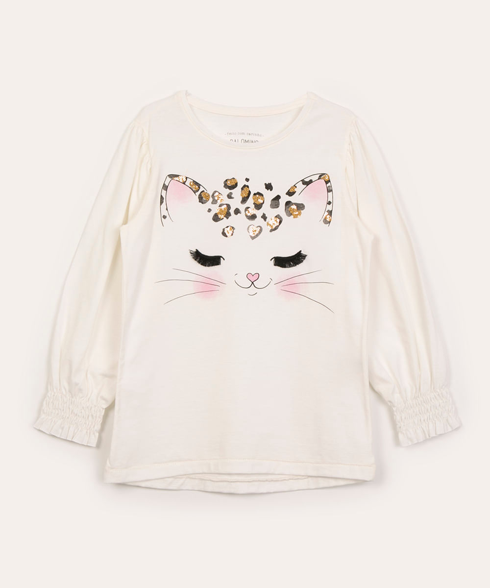 • Estampa frontal de gatinha com detalhes de oncinha e aplicação de paetês dourados para um brilho especial.