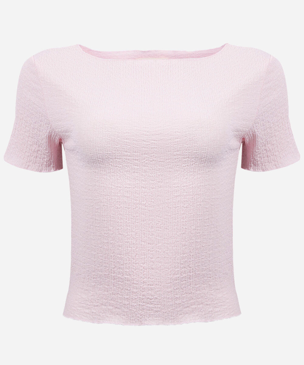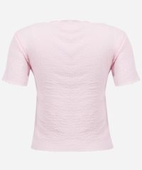 Blusa juvenil confeccionada em malha texturizada. Possui modelagem reta, caimento levemente solto, decote canoa, mangas curtas e barra com acabamento em fru fru.