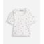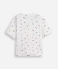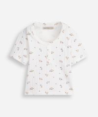 Camiseta juvenil confeccionada em algodão com toque canelado. Possui modelagem reta, mangas curtas, gola redonda, vista com botões decorativos, estampa floral e comprimento cropped.