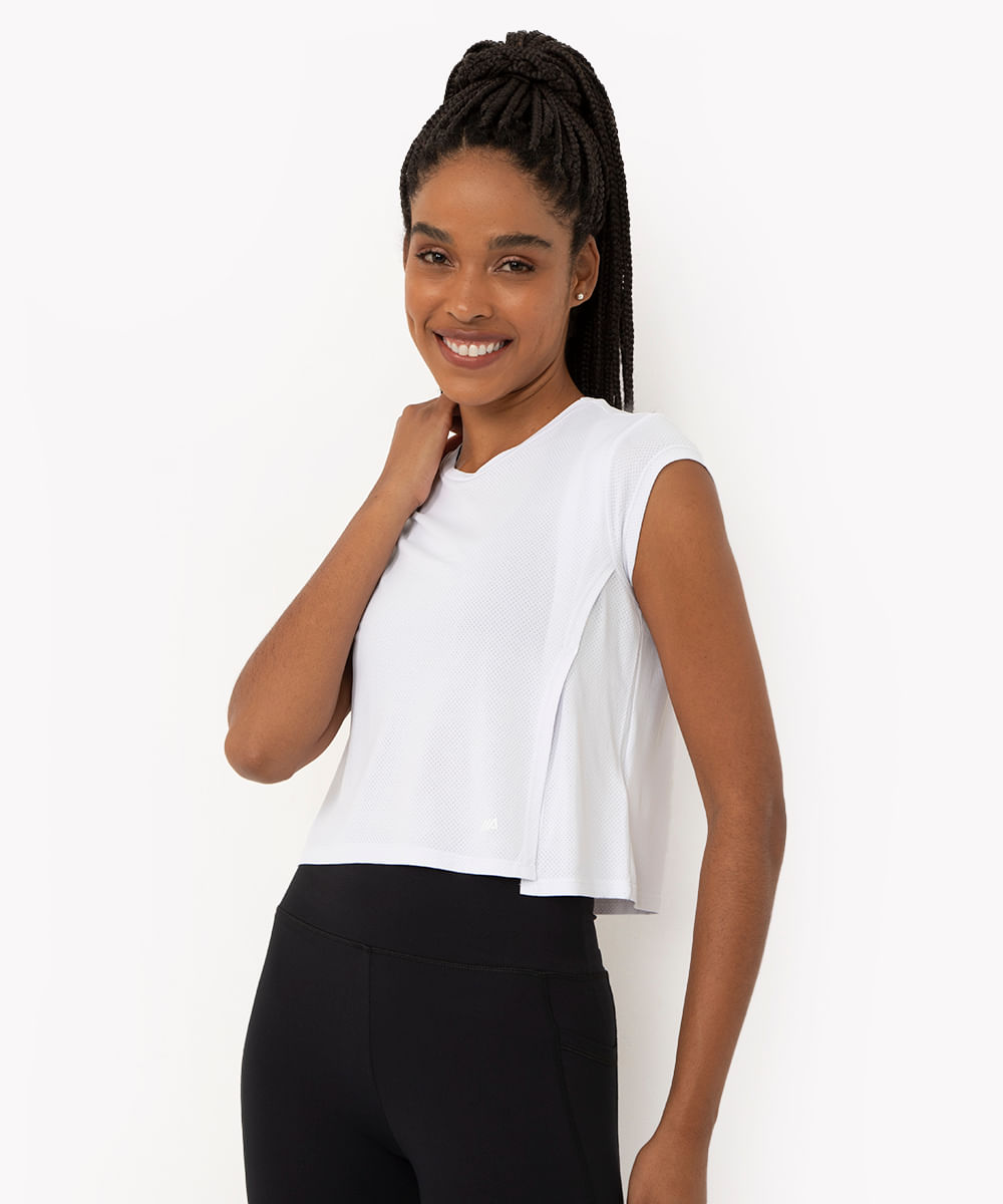 Blusa confeccionada em tecido leve com micro furos. Possui modelagem reta, caimento solto, comprimento cropped, mangas curtas, detalhe em abertura lateral e acabamento em costura pespontada.