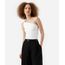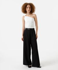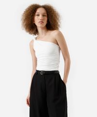 Blusa feminina confeccionada em tecido sintético com toque macio. Possui modelagem reta, caimento justo ao corpo, decote assimétrico, ombro único com detalhe de nó e acabamento pespontado.