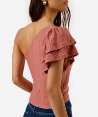 Blusa ombro único feminina confeccionada em malha laise com bordados vazados. A peça tem modelagem reta e caimento ajustado ao corpo. O modelo tem decote diagonal e alça larga com babados aplicados. Detalhe de acabamento pespontado na barra.