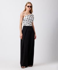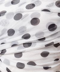 Blusa feminina confeccionada em tule de malha com estampa poá. A peça tem modelagem ombro único, com construção reta, caimento ajustado ao corpo com franzidos laterais que modelam a silhueta. O modelo tem decote assimétrico e alça larga franzida. Possui forro em malha.