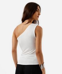 Blusa ombro único feminina confeccionada em malha com toque acetinado. A peça tem modelagem reta e caimento ajustado ao corpo com franzidos laterais que modelam a silhueta. O modelo tem decote diagonal e alça larga. Detalhe de acabamento pespontado na barra.
