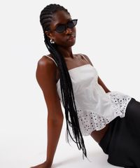 Blusa peplum feminina confeccionada em tecido plano de algodão. A peça tem modelagem acinturada, caimento ajustado ao corpo com recortes que modelam a silhueta e aplicação de laise nas laterais formando volume e franzidos. O modelo tem decote quadrado , fechamento por zíper e alças finas ajustáveis.