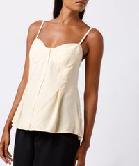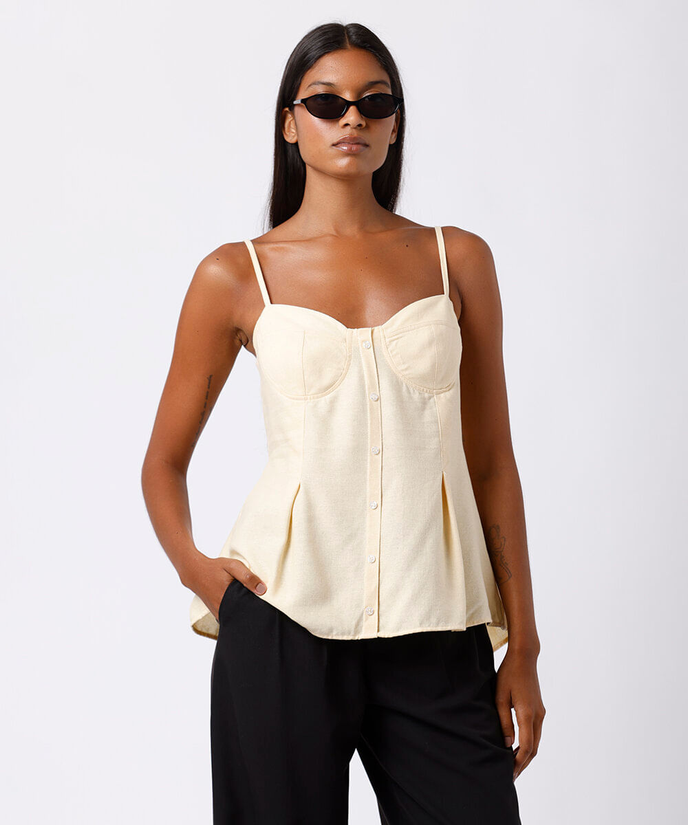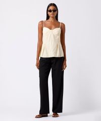 Blusa peplum feminina confeccionada em tecido plano com linho. A peça tem modelagem acinturada, com pregas e barras com leve volume. O modelo tem decote coração com recortes que modelam o busto, vista decorativa de botões, lastex aplicado na parte posterior e alças finas ajustáveis. Detalhe de acabamento pespontado na barra.