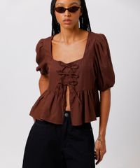 Blusa feminina confeccionada em tecido plano de viscose e linho. A peça tem modelagem levemente acinturada, caimento solto ao corpo, recorte inferior formando franzidos e agregando volume e fenda frontal. O modelo tem decote quadrado, laços frontais e mangas curtas bufantes com elástico embutido nos punhos. Detalhe de acabamento pespontado na barra.
