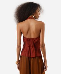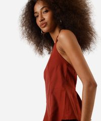 Blusa peplum feminina confeccionada em tecido plano com linho. A peça tem modelagem levemente acinturada, com recortes verticais e leve volume na barra. O modelo tem decote frente única, lastex aplicado na parte posterior e fechamento por botão. Detalhe de acabamento pespontado na barra.