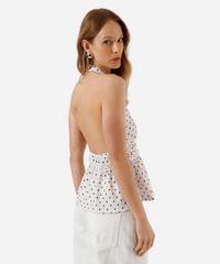 Blusa peplum feminina confeccionada em tecido texturizado com estampa poá. A peça tem modelagem acinturada e recorte inferior que cria volume e forma franzidos. O modelo tem decote frente única com abertura posterior por botão. Possui forro em malha e acabamento pespontado na barra.