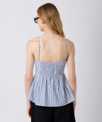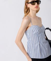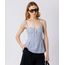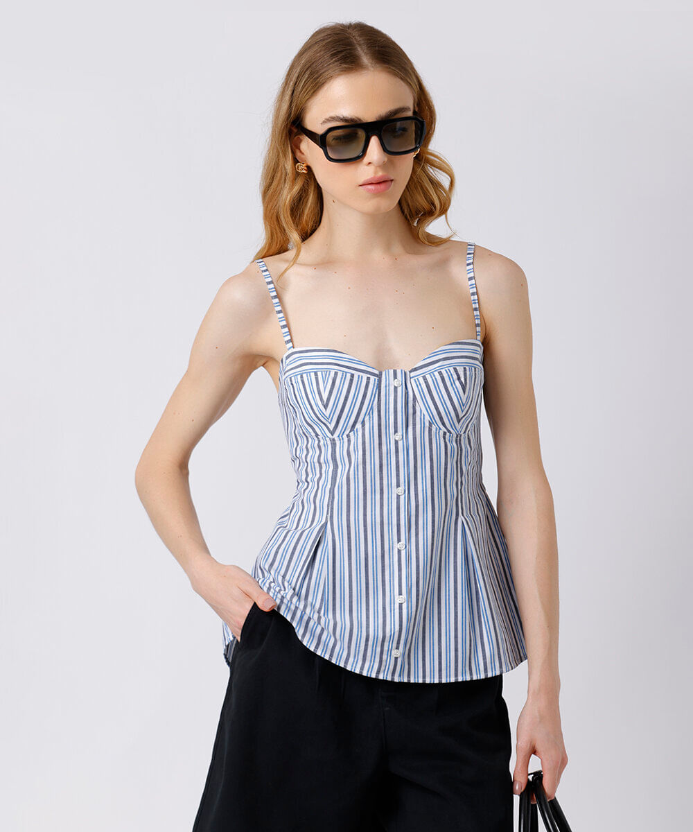 Blusa peplum feminina desenvolvida em tecido plano de algodão com estampa listrada. A peça tem modelagem acinturada, com caimento justo no tronco e amplo na barra. O modelo tem decote coração com recortes que modelam o busto, vista decorativa com botões, lastex aplicado na parte posterior e alças finas reguláveis. Detalhe de acabamento pespontado na barra.
