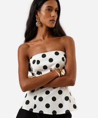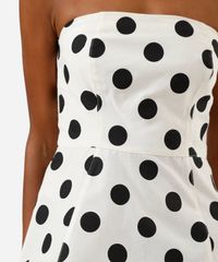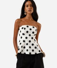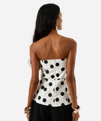 Blusa peplum feminina confeccionada em tecido de algodão com estampa poá. A peça tem a modelagem acinturada, caimento ajustado ao corpo com barras amplas. O modelo tem decote reto, sem alças e com fechamento por zíper posterior.