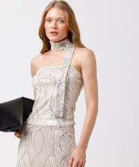 Blusa feminina confeccionada em tule de malha com bordado de paetês. A peça tem caimento ajustado ao corpo. O modelo tem decote reto, sem alças com forro em malha e lenço fixo para estilização no pescoço.