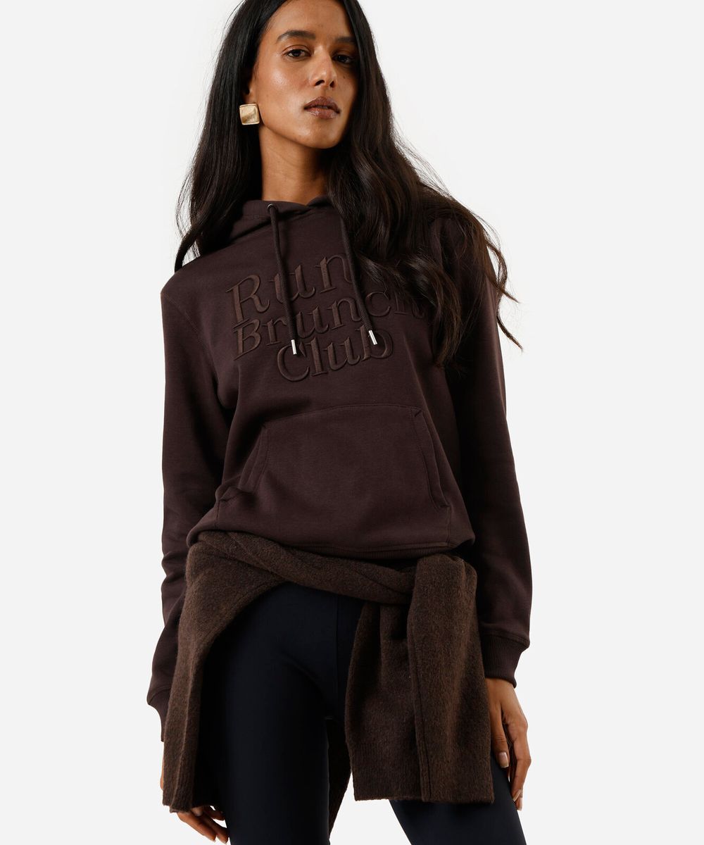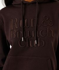 Blusão feminino confeccionada em malha moletom com bordado escrito "run & brunch club" na parte frontal. A peça tem a modelagem e construção reta e o caimento é confortavelmente solto ao corpo. O modelo tem capuz fixo, forrado e cordão e mangas longas. Possui um bolso canguru e acabamento em malha canelada nos punhos e na barra.