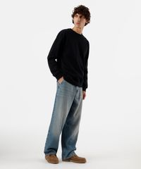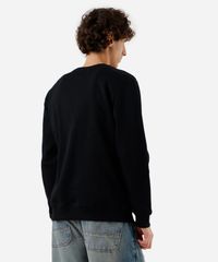 Blusão masculino confeccionado em moletom. A peça tem a modelagem e construção reta e o caimento é solto ao corpo. O modelo tem gola redonda e mangas longas. Detalhe de acabamento canelado nos punhos e na barra.