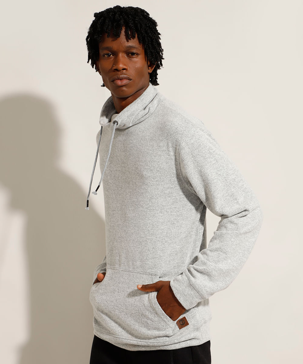 Blusão masculino desenvolvido em moletom mescla leve. A modelagem é ampla com caimento solto. Possui um bolso canguru frontal. A gola é alta e transpassada com cordão de ajuste embutido.