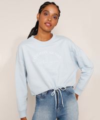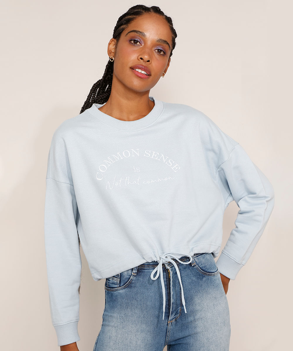 Blusa feminina desenvolvida em moletom sem felpa. A modelagem é bem ampla com cavas deslocadas, comprimento curto e caimento solto. Tem bordado frontal com o texto "Common sense is not that common". Possui cordão de ajuste embutido na barra, formando volume. O decote redondo e os punhos são feitos em ribana.