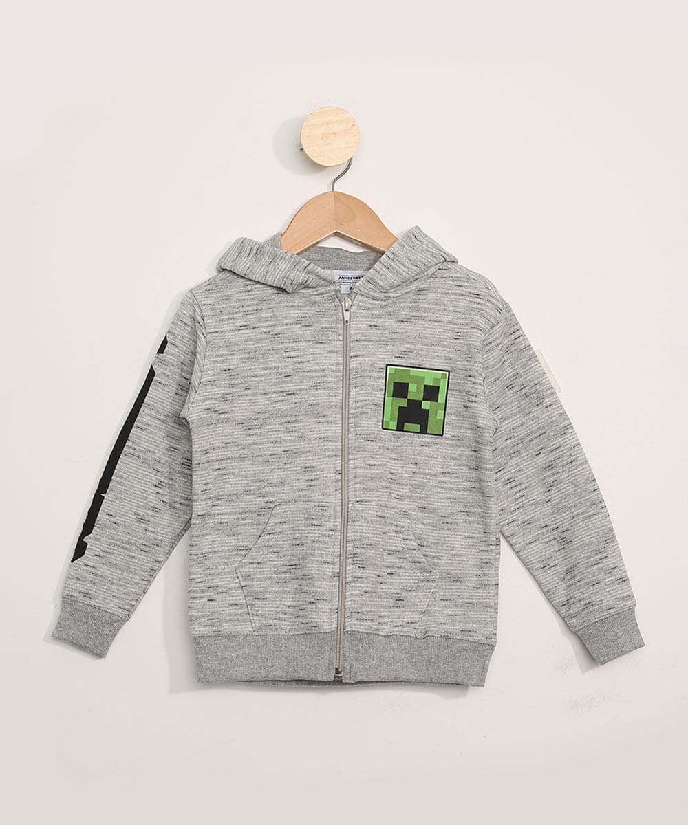 Blusa infantil masculina confeccionada em moletom felpa. O modelo tem fechamento frontal por zíper, bolso canguru e capuz com forro. Possui estampa frontal e na manga do jogo Minecraft. A barra e punhos são em ribana.