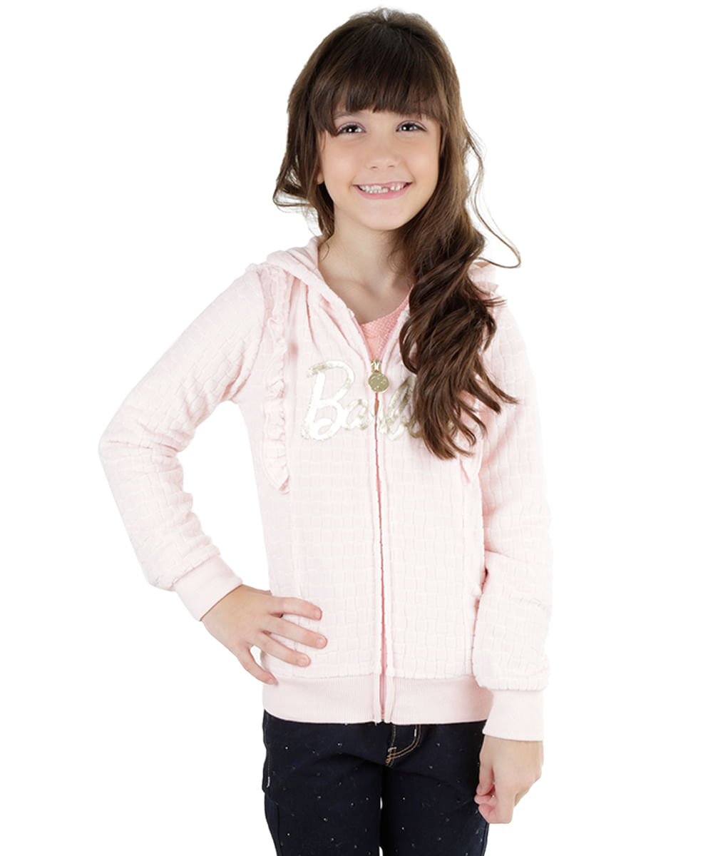 Blusão confeccionado em moletom de toque macio. O charme do modelo é o tecido com toque aveludado e a estampa metálica "Barbie". O decote tem capuz aplicado e o fechamento é por zíper. O acabamento é em ribana.