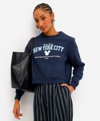Blusão cropped feminino confeccionada em moletom felpado com estampa localizada do Mickey e a frase "New York City" na parte frontal. A peça tem a modelagem e construção reta e o caimento é confortavelmente solto ao corpo. O modelo tem gola redonda e mangas longas. Detalhe de acabamento em malha canelada nos punhos, gola e barra.